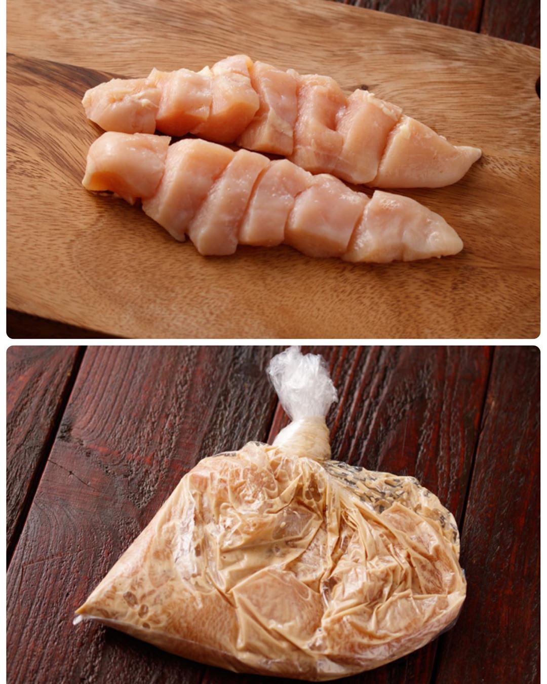 1️⃣鶏肉は皮を取り、フォークで数カ所穴をあける。縦半分に切ってから1〜1.5cm幅のそぎ切りにし、【A】を揉み込んで10分ほどおく。