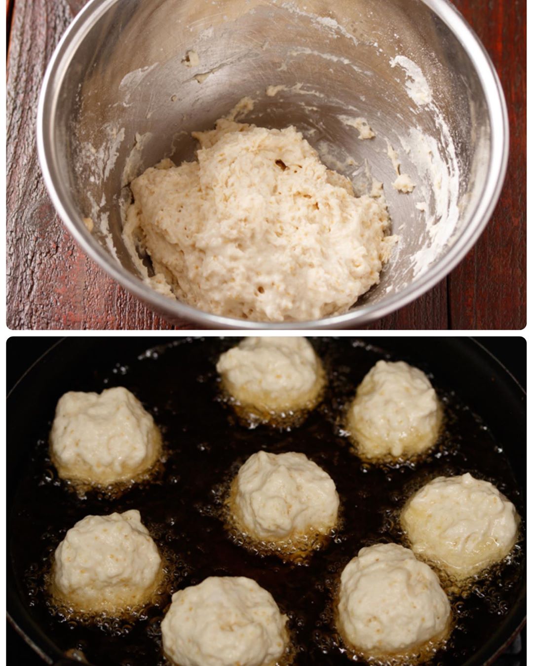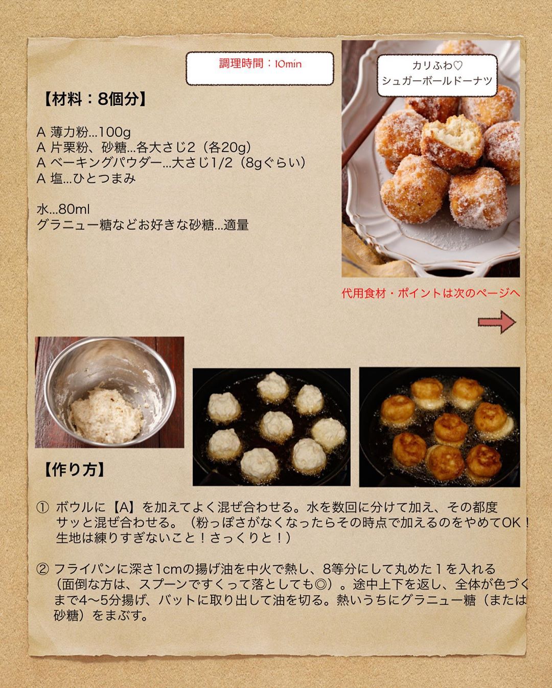 2️⃣フライパンに深さ1cmの揚げ油を中火で熱し、8等分にして丸めた1を入れる(面倒な方は、スプーンですくって落としても◎)。途中上下を返し、全体が色づくまで4〜5分揚げ、バットに取り出して油を切る。熱いうちにグラニュー糖(または砂糖)をまぶす。