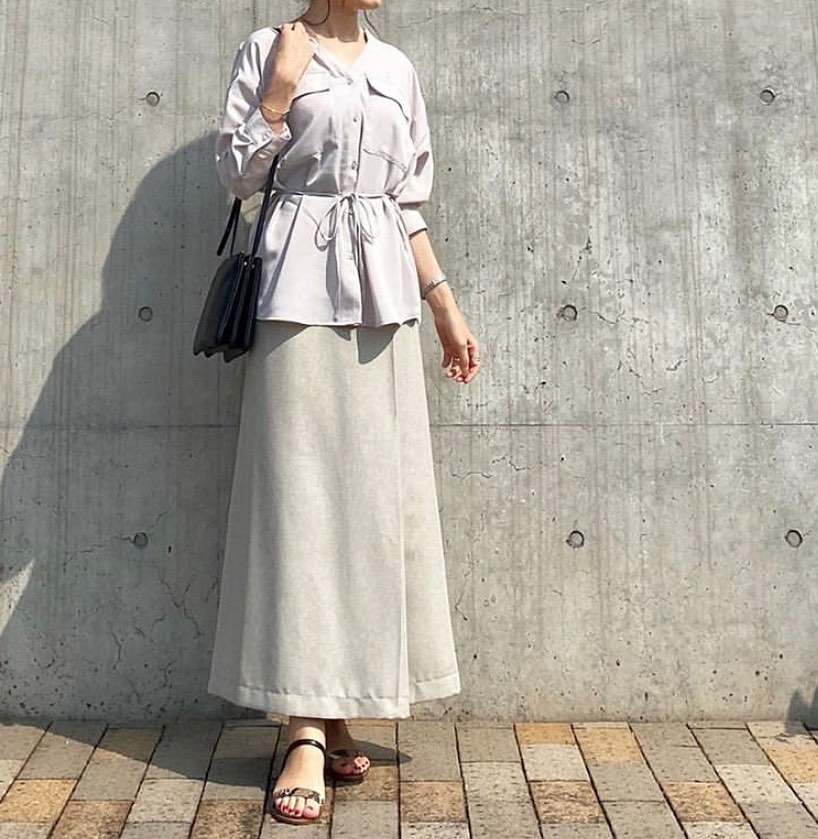 マットサテンダブルポケットシャツコーデをPick up!マットなサテン素材が新鮮なダブルポケットシャツ✨さりげないウエストマークでメリハリがつくから、とっても綺麗なシルエット👌ロングスカートとのバランスも絶妙です🥰襟元もスッキリだから、肌感もきれいに見せてくれてGOOD👍