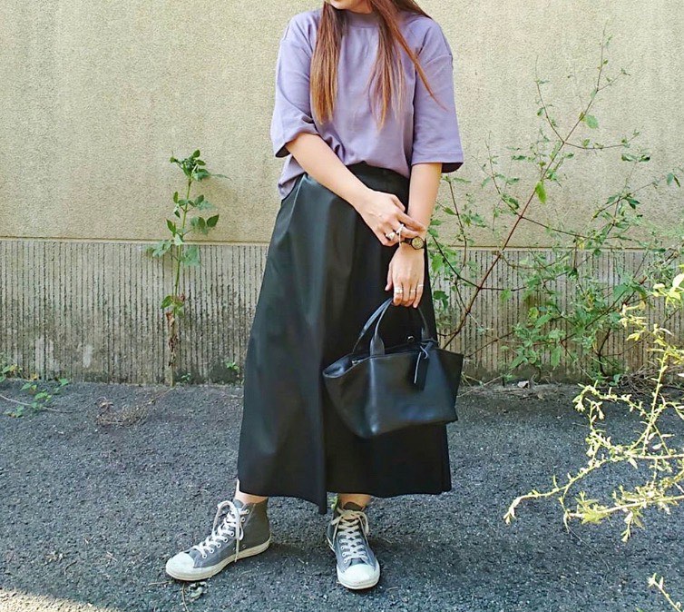 今の季節に使いやすい、五分袖のデザインのハイネッククロップドT✨と、フェイクレザーがちょい辛口で、可愛いミディスカート😘季節を感じるスカートをチョイスしたら、おしゃれ映え間違いなし👌上下ともシンプルデザインながら、組み合わせ方で、着こなしの魅力の上がるアイテムです🙌