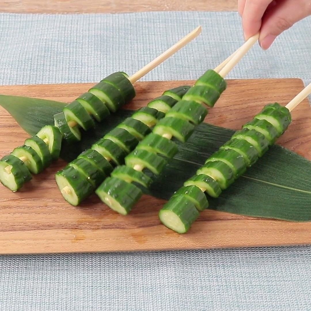 1. きゅうりは半分の長さに切り、割り箸を刺し、回しながららせん状に切り込みを入れ割り箸に沿って広げます。