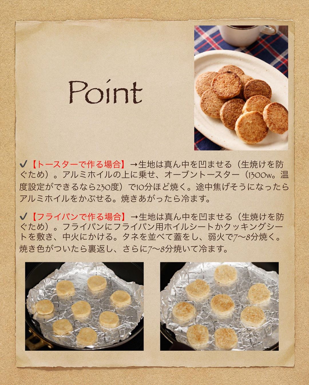 2️⃣1に【A】を加えて混ぜ合わせ、よく捏ねる。ひとまとめになったら直径4cmの円筒状に成形し、包丁で8mm厚さの輪切りにする。オーブンで焼く場合は、天板にクッキングシートを敷いて並べ、トースターの場合はアルミホイルの上に並べる。