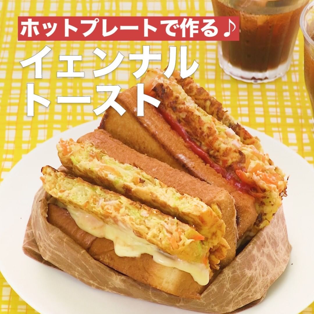 옛날(イェンナル)トーストとは、韓国語で「昔からのトースト」という意味です。バターで焼いたトーストに砂糖や、ケチャップをぬり、千切りにしたキャベツや人参やハムなどを卵でとじたものをはさんだホットサンドイッチです。本場では屋台などで鉄板を使って作ったりしますが、今回はご家庭でも気軽に作れるよう、ホットプレートを使ってアレンジしました。ボリュームのある卵焼きと、とろとろチーズのボリュームホットサンドは絶品!バターの風味と甘じょっぱい味わいが食欲をそそります!