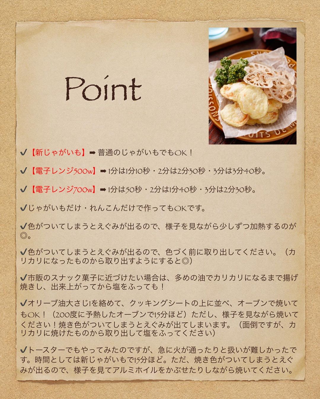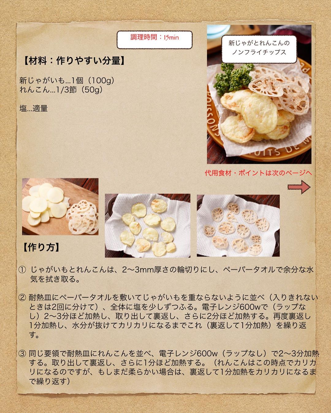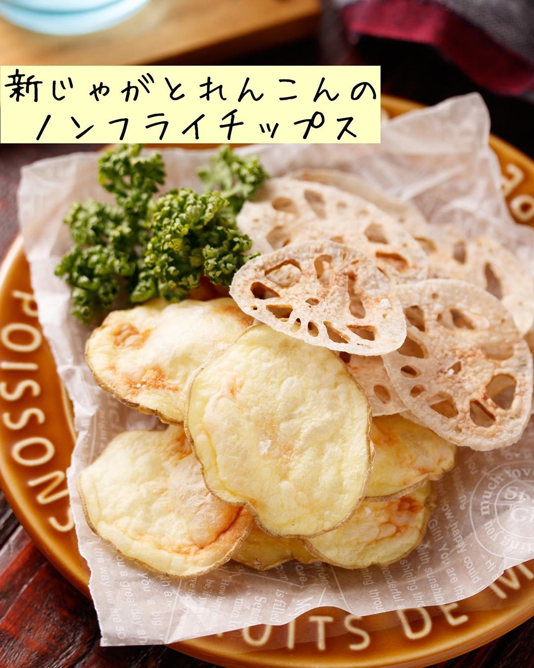 1️⃣じゃがいもとれんこんは、2〜3mm厚さの輪切りにし、ペーパータオルで余分な水気を拭き取る。