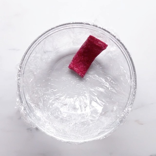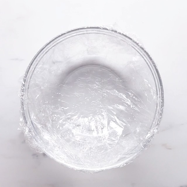 4.ボウルに、フチから10cm以上余分が出るように、ラップを敷き詰める。