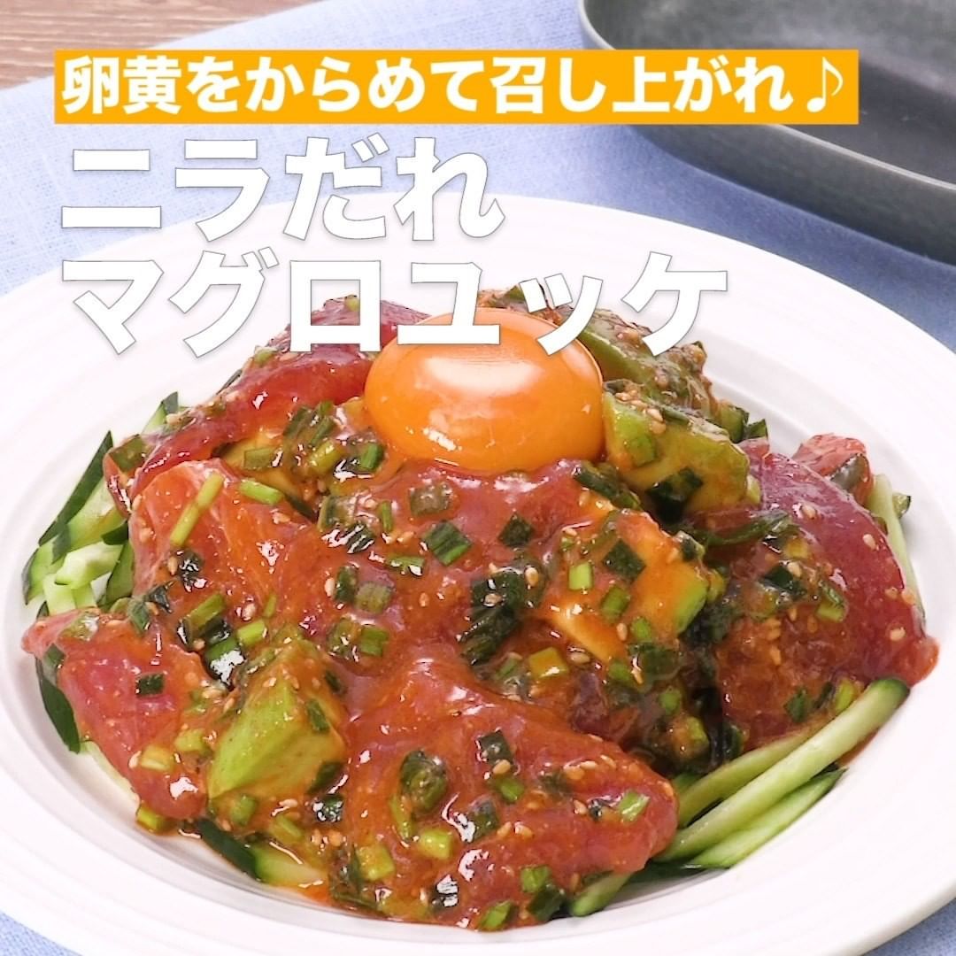 ⑨<卵黄をからめて召し上がれ♪ニラだれマグロユッケ>