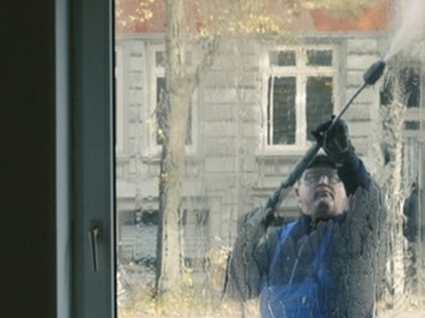 高圧洗浄機で、建物の外壁や窓ガラスを洗う。