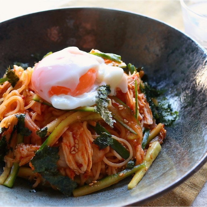 韓国で人気のビビン麺をそうめんで再現しました。コチュジャンが効いた甘辛ダレがなんとも美味しい!具材はお好きなものを入れていただいて大丈夫ですよ!「混ぜる」という意味があるビビン麺、お好きな具材を混ぜてお召し上がり下さいね。