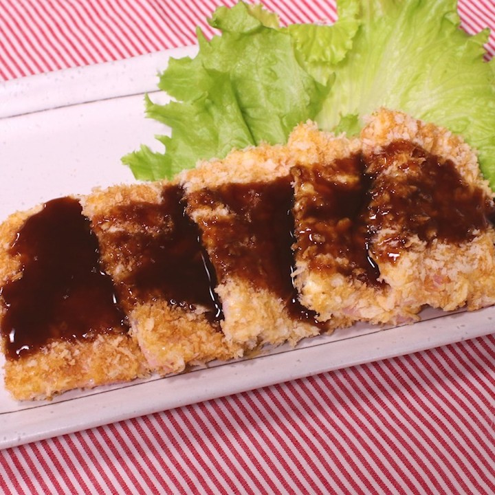 4. 器に盛り付けて、中濃ソースをたっぷりとかけて出来上がりです。