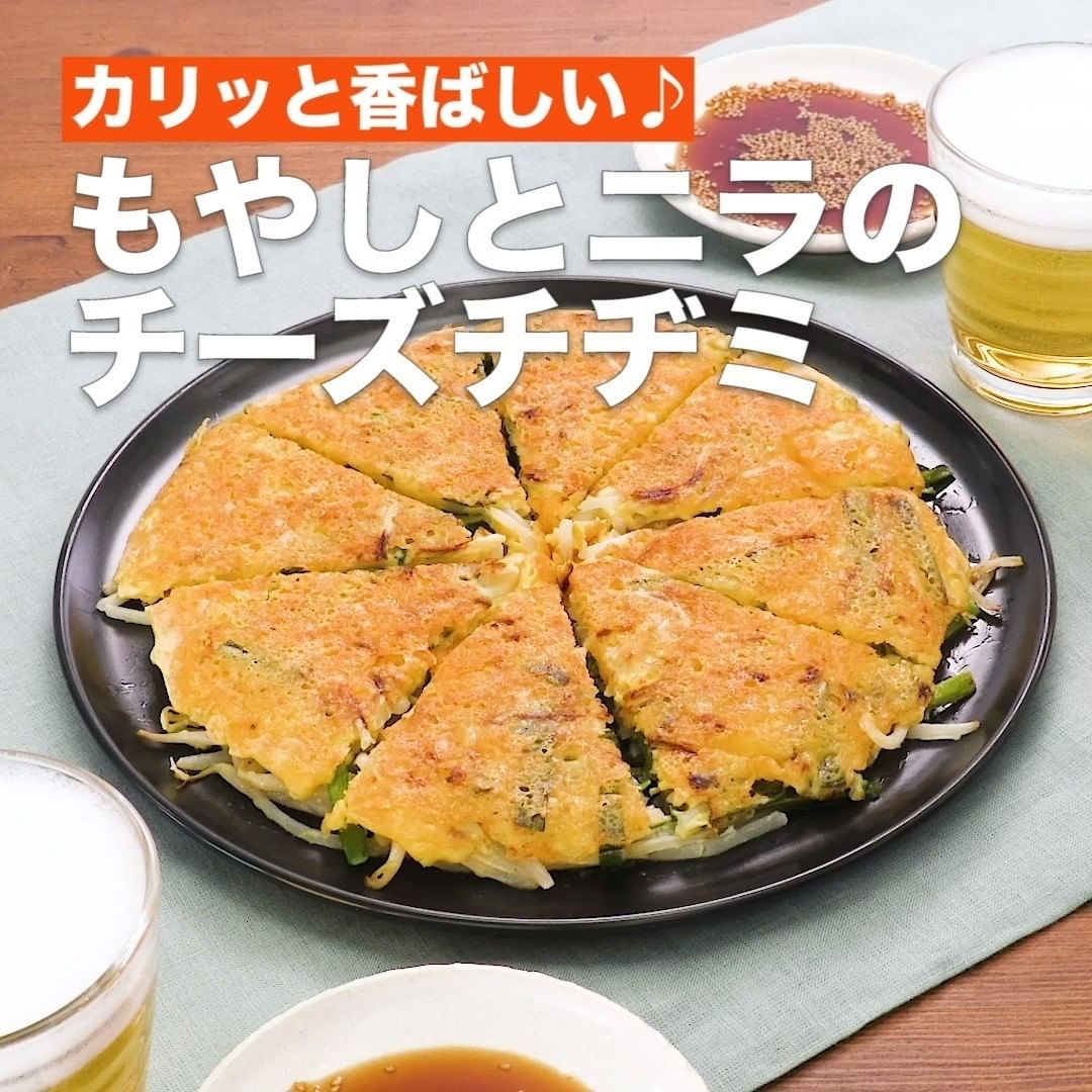 食感のあるもやしとニラ、こんがりと焼けたチーズがやみつきになるチヂミを作ります♪もっちりとした生地とたっぷりと入れたもやしとニラで、食べ応え十分な一品です。