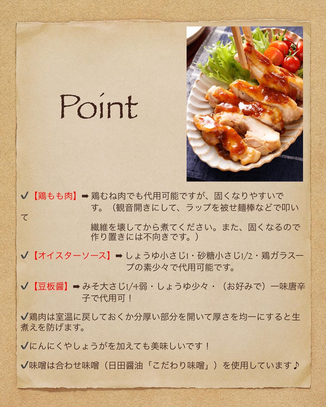 ✔️「代用食材/調味料」「調理のポイント」を掲載