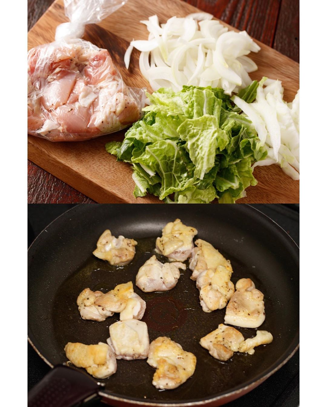 白菜は葉と芯に分け、葉はザク切りに、芯は細切りにする。玉ねぎは薄切りにする。鶏肉は一口サイズに切り、塩・こしょうを揉み込んで薄力粉をまぶす(ポリ袋を使うと便利!)。