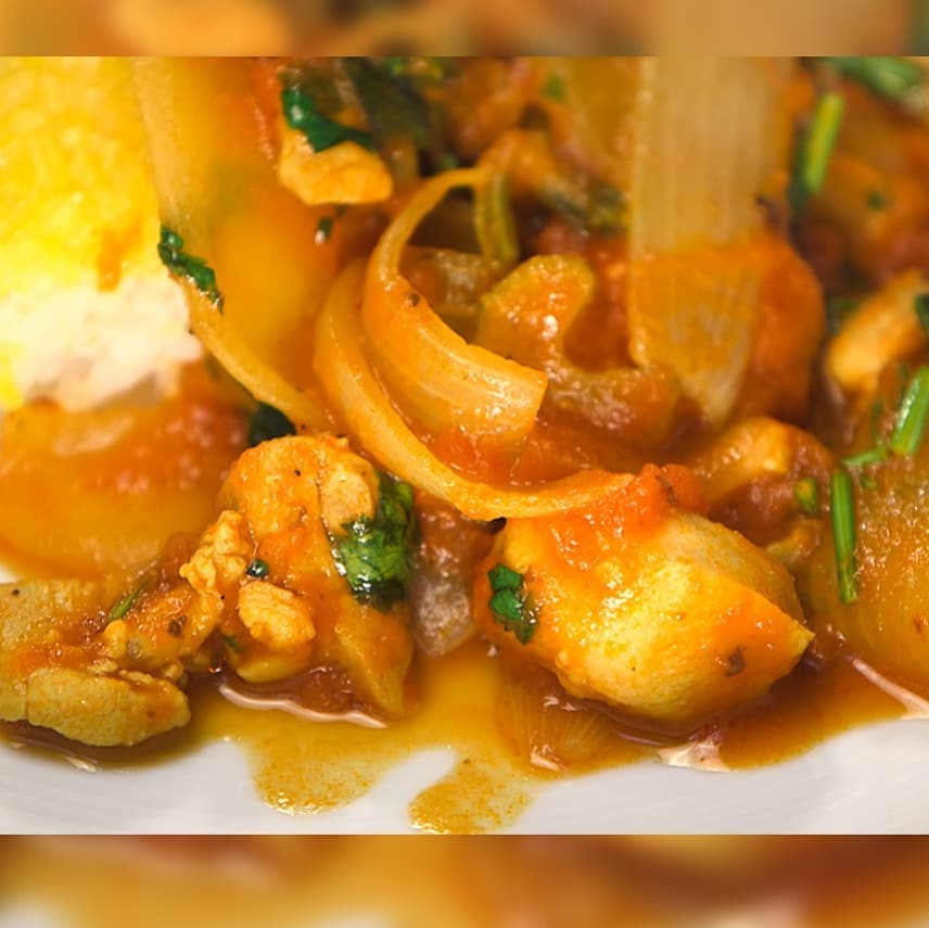 ⑥火が通ったらターメリック(適量)カットトマト缶(1缶)②で残ったサフラン、トマトチリソース(大さじ3)を入れて煮る
