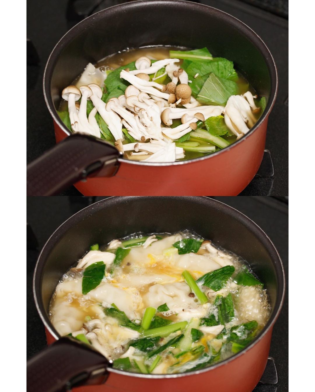 鍋に【A】を入れて強火にかけ、沸騰したら冷凍餃子を入れて中火にし3分ほど煮る。餃子に火が通ったら、1を加えてサッと煮る。