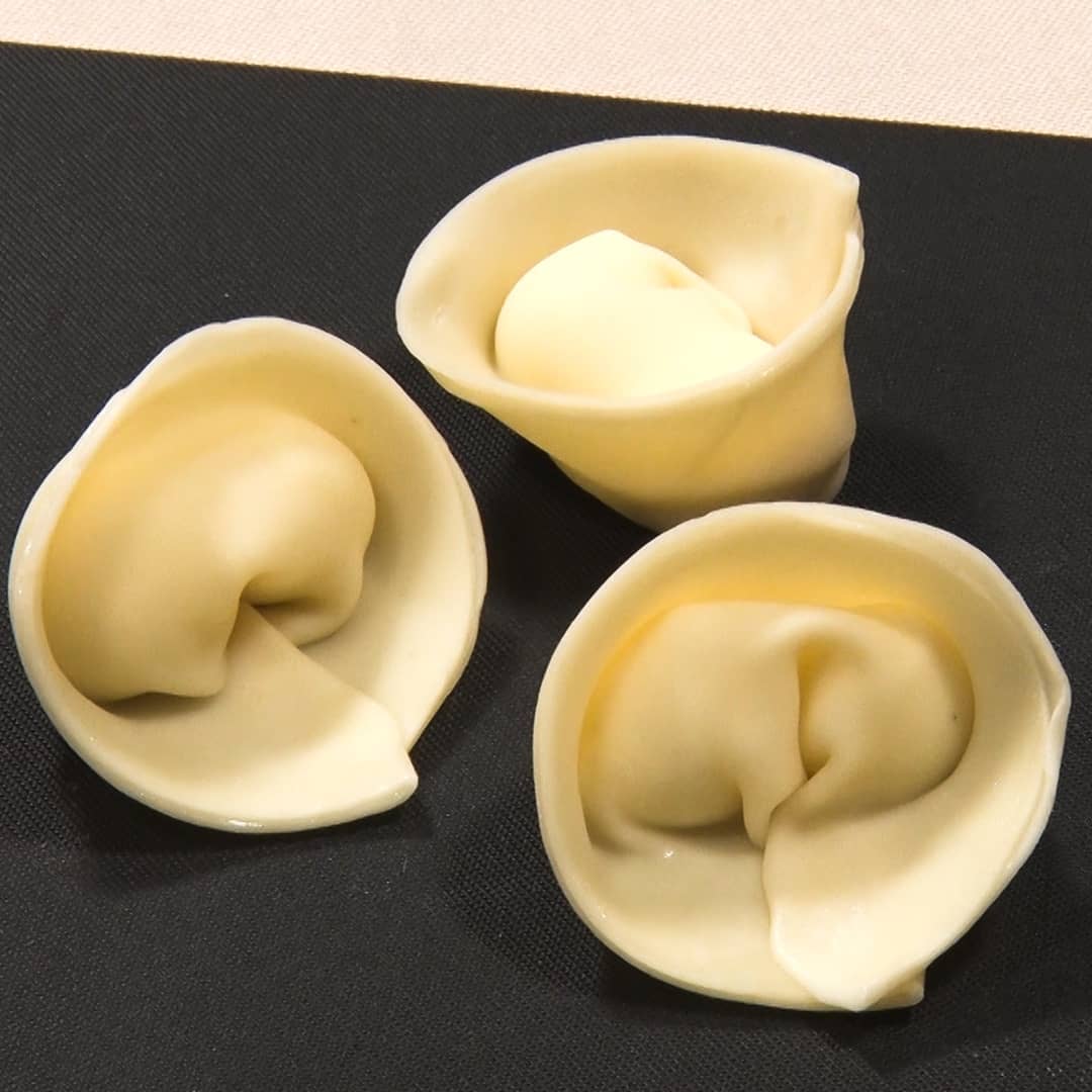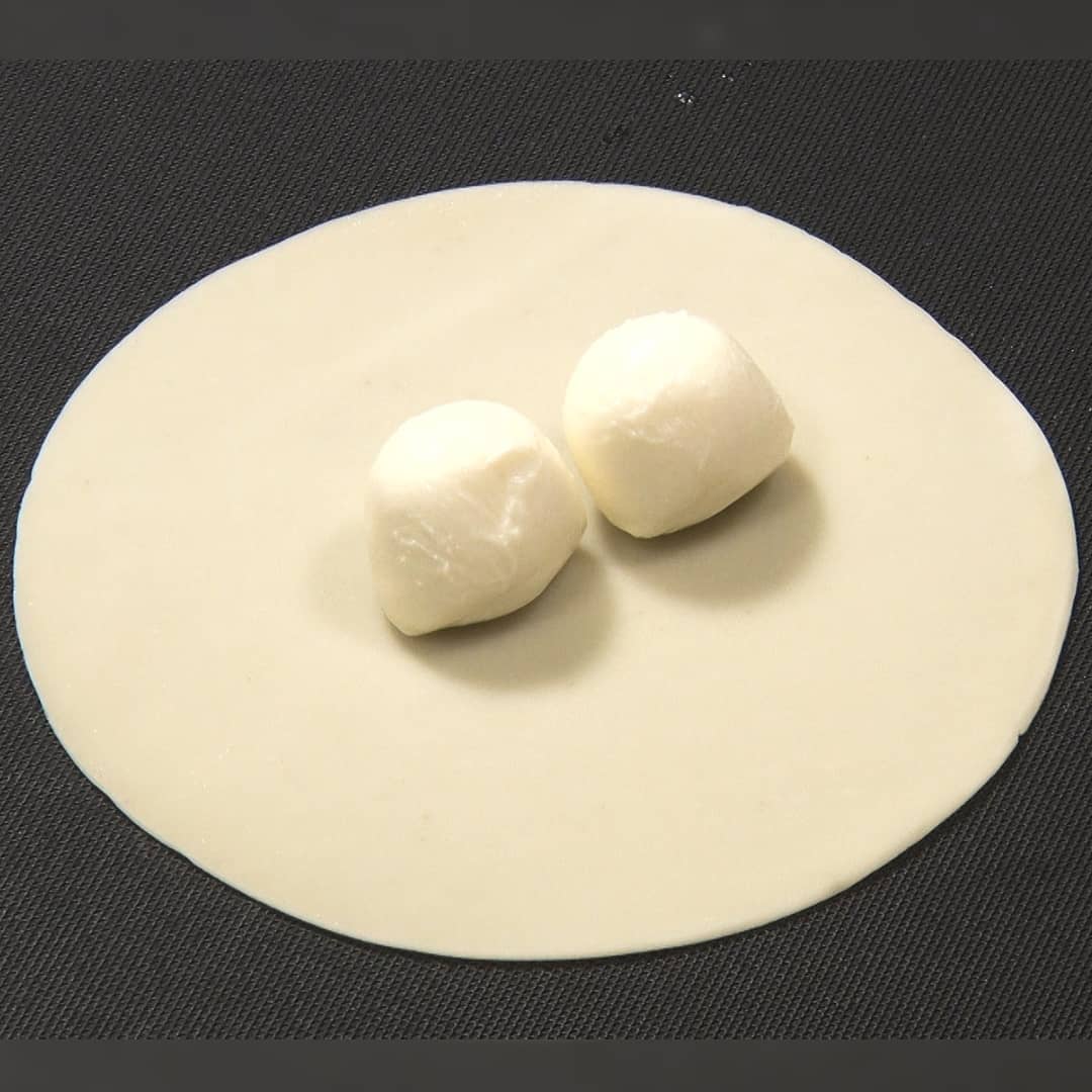 ①モッツァレラチーズ(2〜3個)を餃子の皮の上にのせ包む