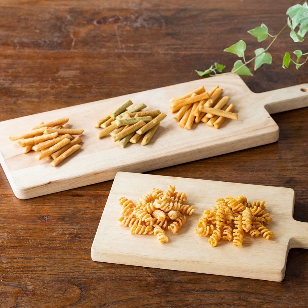 カリッとした食感のパスタスナックとノンフライスナックは、おつまみにも楽しめる味わいに仕上げました。