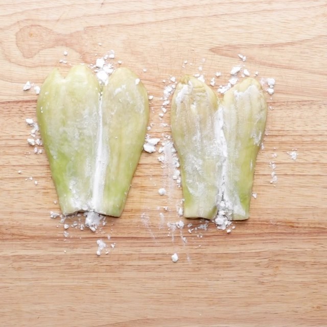 2. なすはヘタを落として皮をむく。ラップに包んで耐熱皿にのせ、600Wの電子レンジで2-3分加熱する。粗熱を取り、中心に切り込みを入れて開き、左右にも切り込みを入れて平らにする。