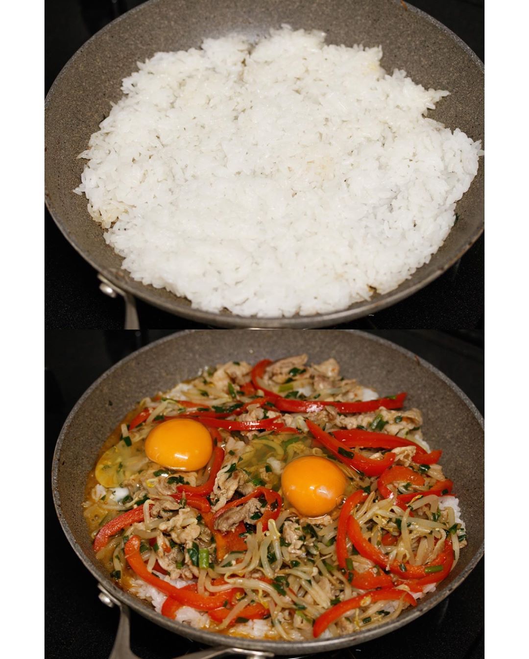 同じフライパンにごま油大さじ1/2を中火で熱し、温かいご飯を広げて焼く。うっすら焼き色がついたら②を上に乗せ、卵を割り入れる。蓋をして3分ほど蒸し、卵が好みの固さになったら完成。