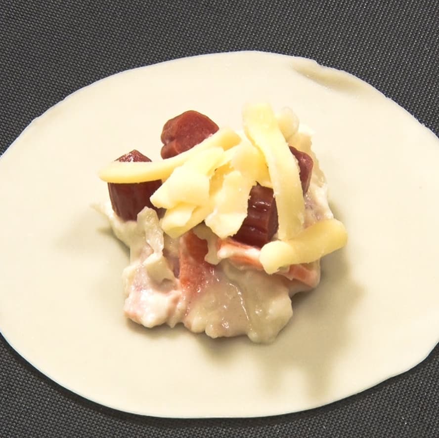 ③ポテトサラダの上にカルパスを乗せ、その上からピザ用チーズ(適量)をかけ、包む