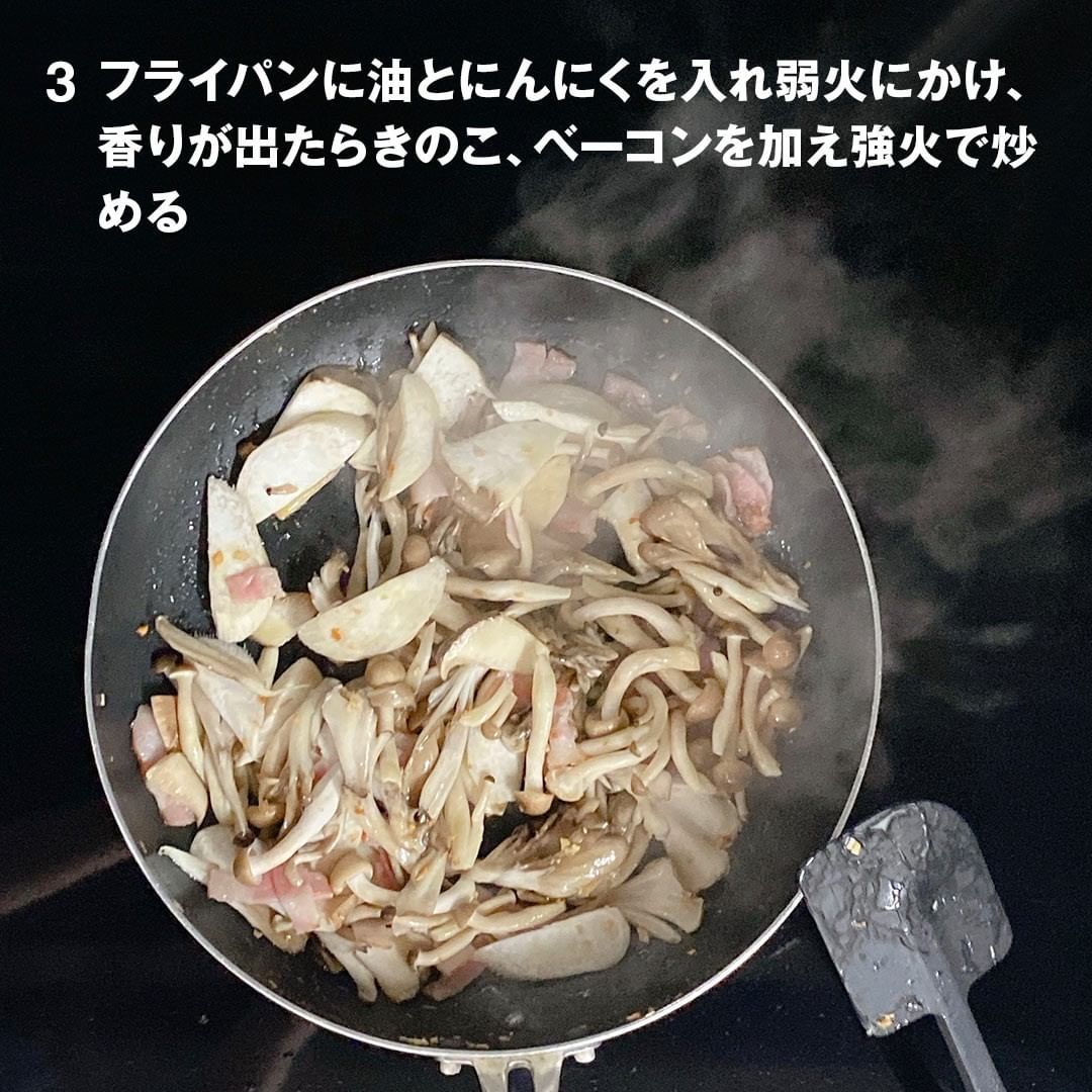 3.フライパンに油とにんにくを入れ弱火にかけ、香りが出たらきのこ、ベーコンを加え強火で炒める。