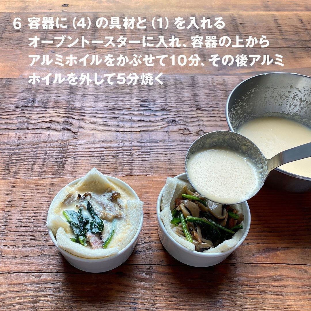 6.容器に(4)の具材と(1)を入れる。オーブントースターに入れ、容器の上からアルミホイルをかぶせて10分、その後アルミホイルを外して5分焼く。