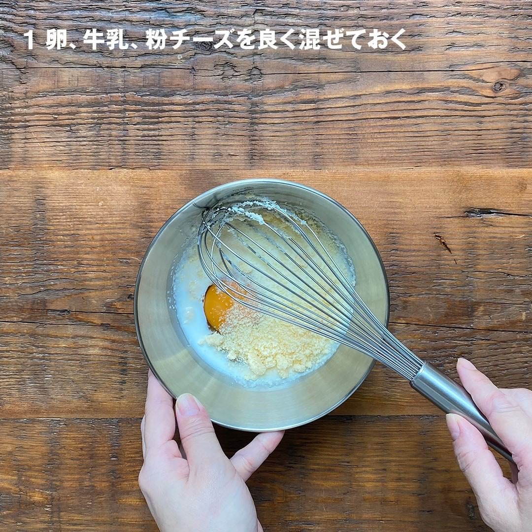 1.卵、牛乳、粉チーズを良く混ぜておく。