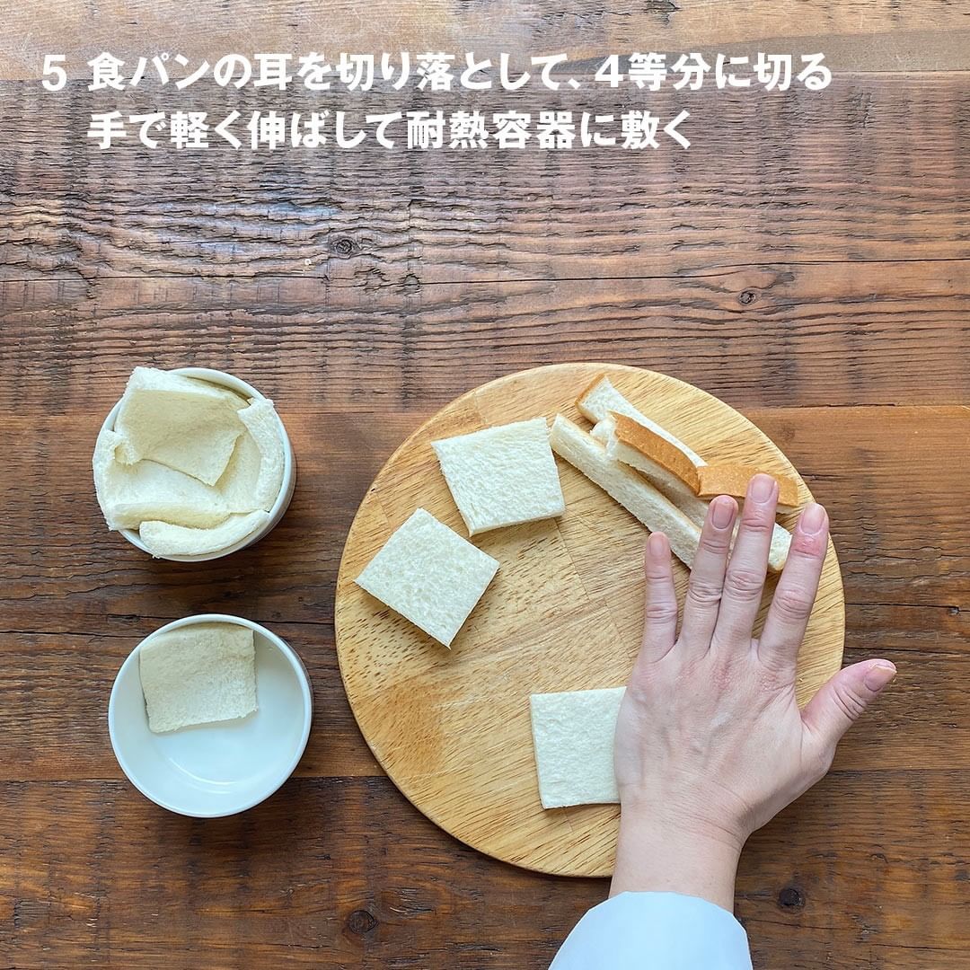 5.食パンの耳を切り落として、4等分に切る。手で軽く伸ばして耐熱容器に敷く。
