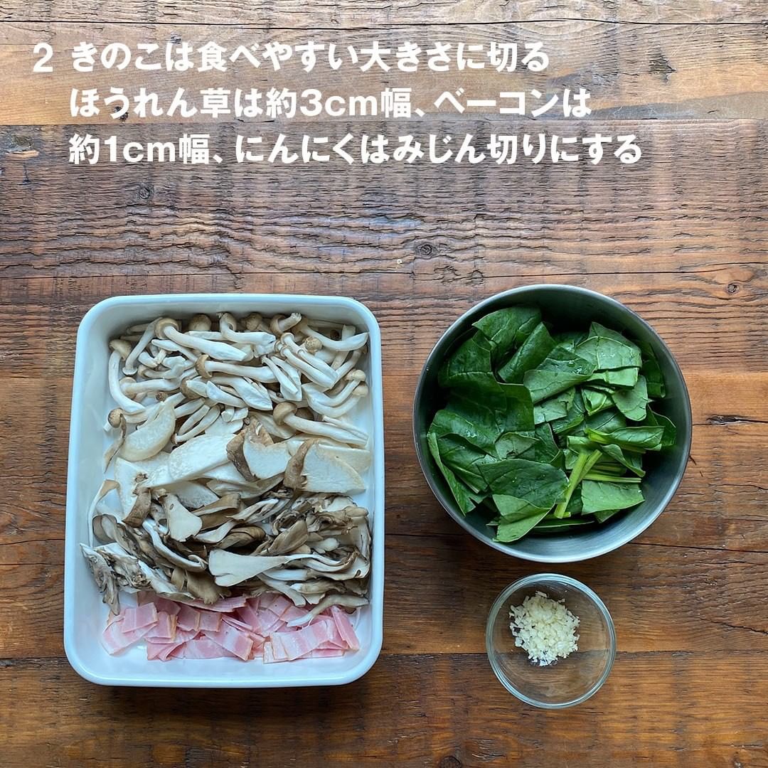 2.きのこは食べやすい大きさに切る。ほうれん草は約3cm幅、ベーコンは約1cm幅、にんにくはみじん切りにする。