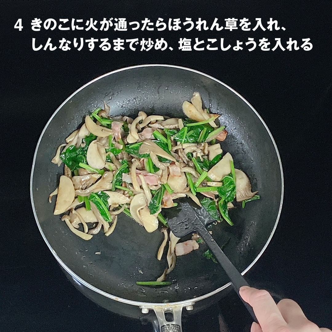 4.きのこに火が通ったらほうれん草を入れ、しんなりするまで炒め、塩とこしょうを入れる。