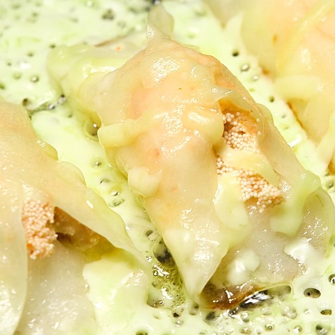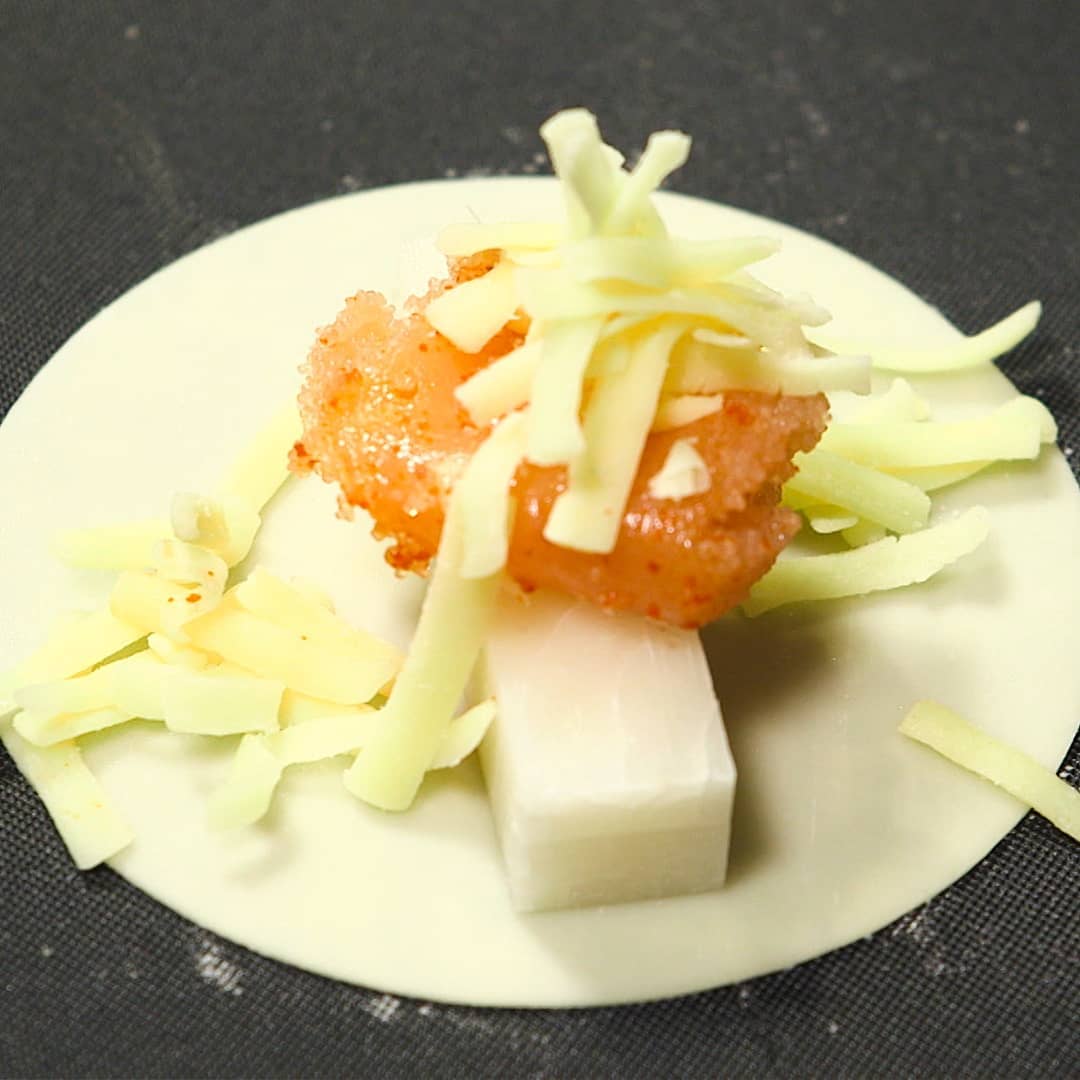 ②餃子の皮に切り餅→明太子→チーズの順に具材をのせ包む