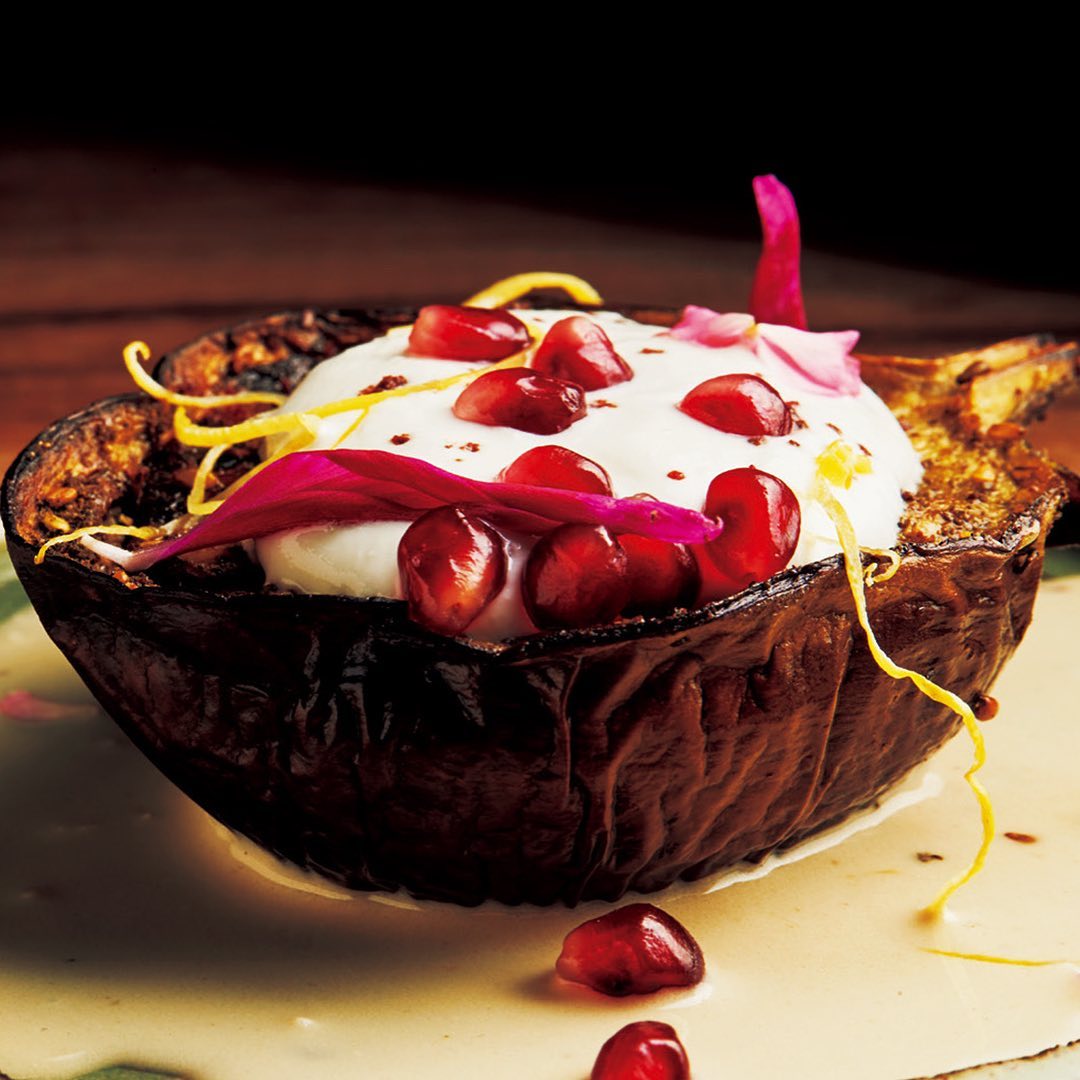①タヒニやヨーグルトのソースで食べる、エスニックな味わいの「 #焼きナスとザクロのサラダ 」