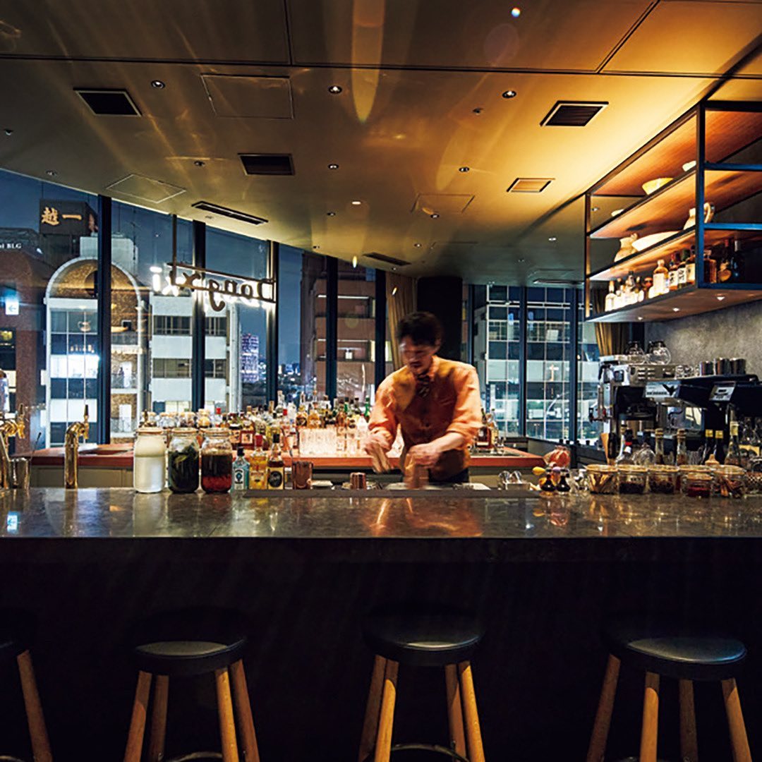 ⑤5F入口にはバーカウンターを設置し、向かいにはテーブル席がある