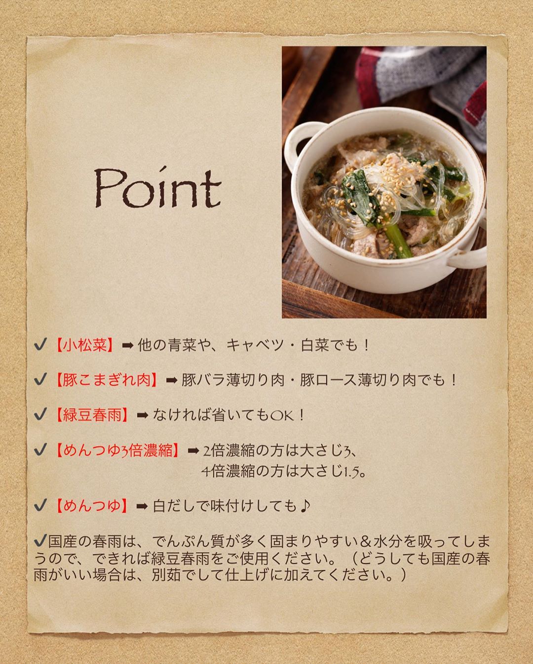 ✔️国産の春雨は、でんぷん質が多く固まりやすい&水分を吸ってしまうので、できれば緑豆春雨をご使用ください。(どうしても国産の春雨がいい場合は、別茹でして仕上げに加えてください。)