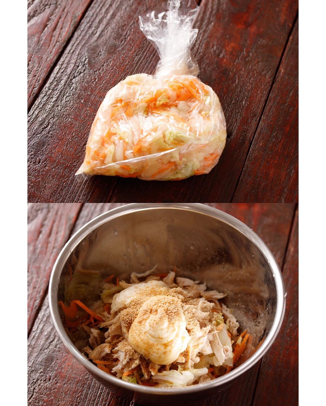 白菜は葉と芯に分け、葉は手でちぎち芯は細切りにする。にんじんは千切りにする。ポリ袋に入れて【a】を揉み込み、しんなりしたら空気を抜いて口を閉じ、3分おく。