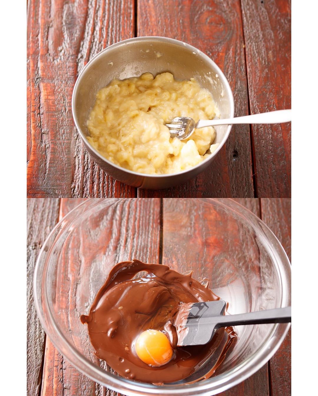 板チョコは手で割って耐熱容器に入れ、電子レンジ600wで約1分30秒加熱する。ヘラなどでよく混ぜ合わせて溶かす。バナナは皮をむき、フォークでつぶしてペースト状にする。