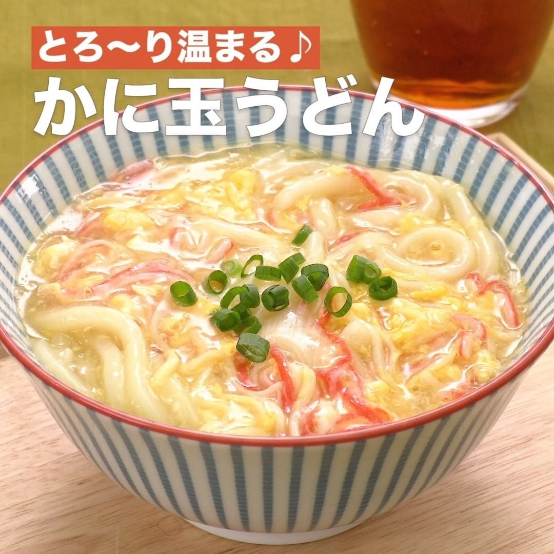夏なのに肌寒い、、そんな日におすすめのおうどんです!かにかまぼこでお手軽に作るかに玉を、とろみをつけたうどんに流し入れてふんわりとじます♪かにかまぼこと卵の色が鮮やかな一品です。