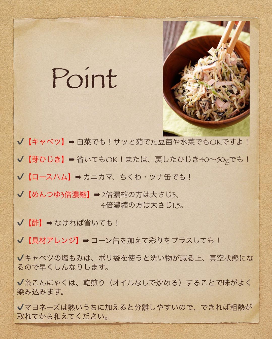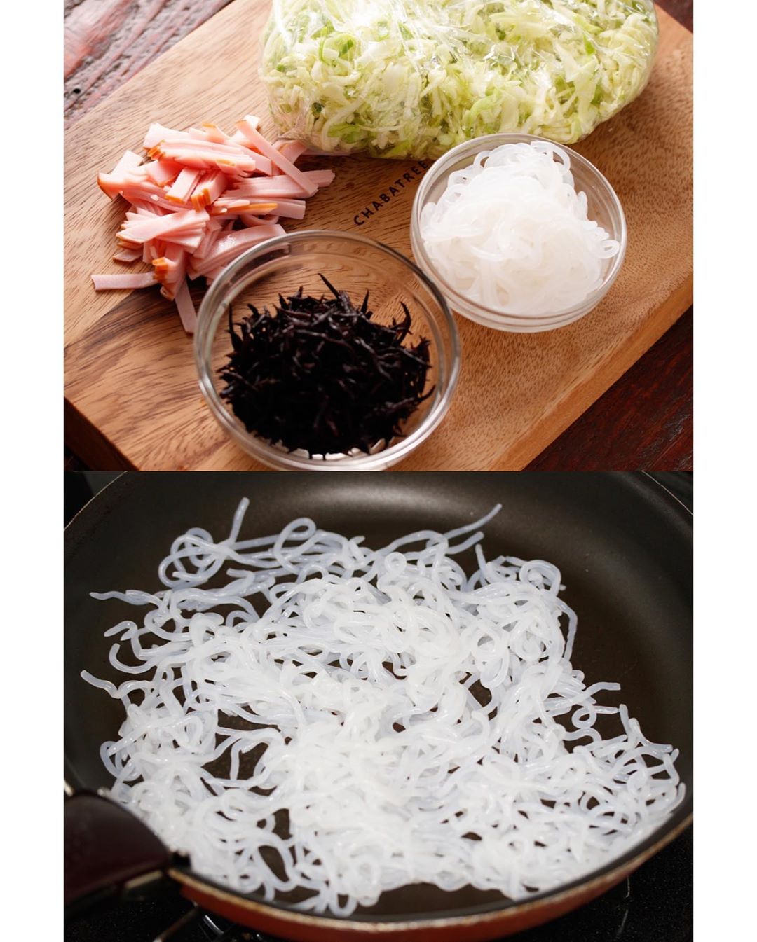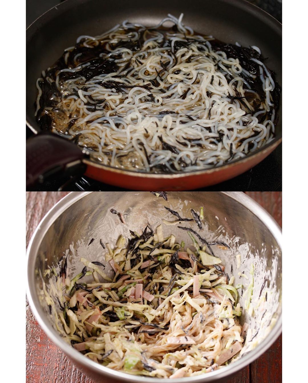 キャベツは太めの千切りにし、塩で揉んで5分おく。しらたきは耐熱容器に入れ、かぶるくらいの水を注ぐ。電子レンジ600wで約3分加熱し水気をきる。乾燥芽ひじきは、たっぷりの水でもどす(目安は20分ぐらいですが、お急ぎの方は耐熱容器に水200ccとともに入れ2分チンして3分蒸らしても!)。ロースハムは、細切りにする。