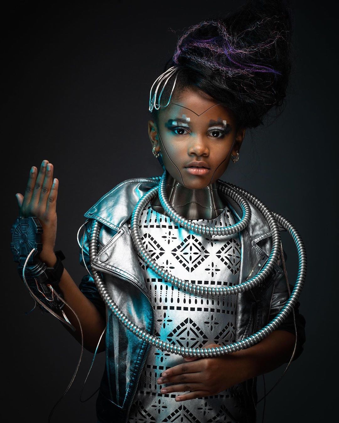 “Glory is a photography book that shatters the conventional standards of beauty for black children. In the book, @creativesoulphoto highlights a wide variety of kids across the African diaspora. @amoy.antunet is a 9-year-old neuroscientist from Atlanta, Georgia. Her love for science began at the age of three, when she became fascinated with a microscope belonging to her father. She has been featured in several media outlets around the world and is currently the youngest person ever to present at a neural convention. For our shoot with Amoy, we decided to incorporate our love of sci-fi for this shot to create an Afrofuturism look. Her futuristic arm piece was created from toys spray painted to match the scene. For her robotic neck, we took a photo of a toy robot in the same lighting and merged it with her photo in Photoshop.”