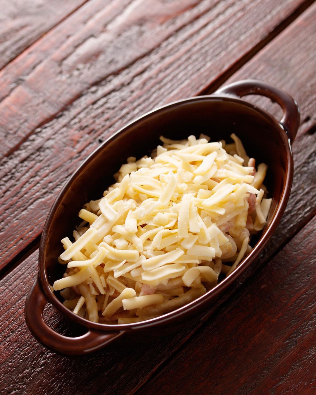 3を耐熱容器に入れ、ピザ用チーズを散らす。オーブントースター(230度使用)でチーズが溶けるまで5分ほど焼いたら完成!(焼きすぎると水分が飛ぶので注意!)
