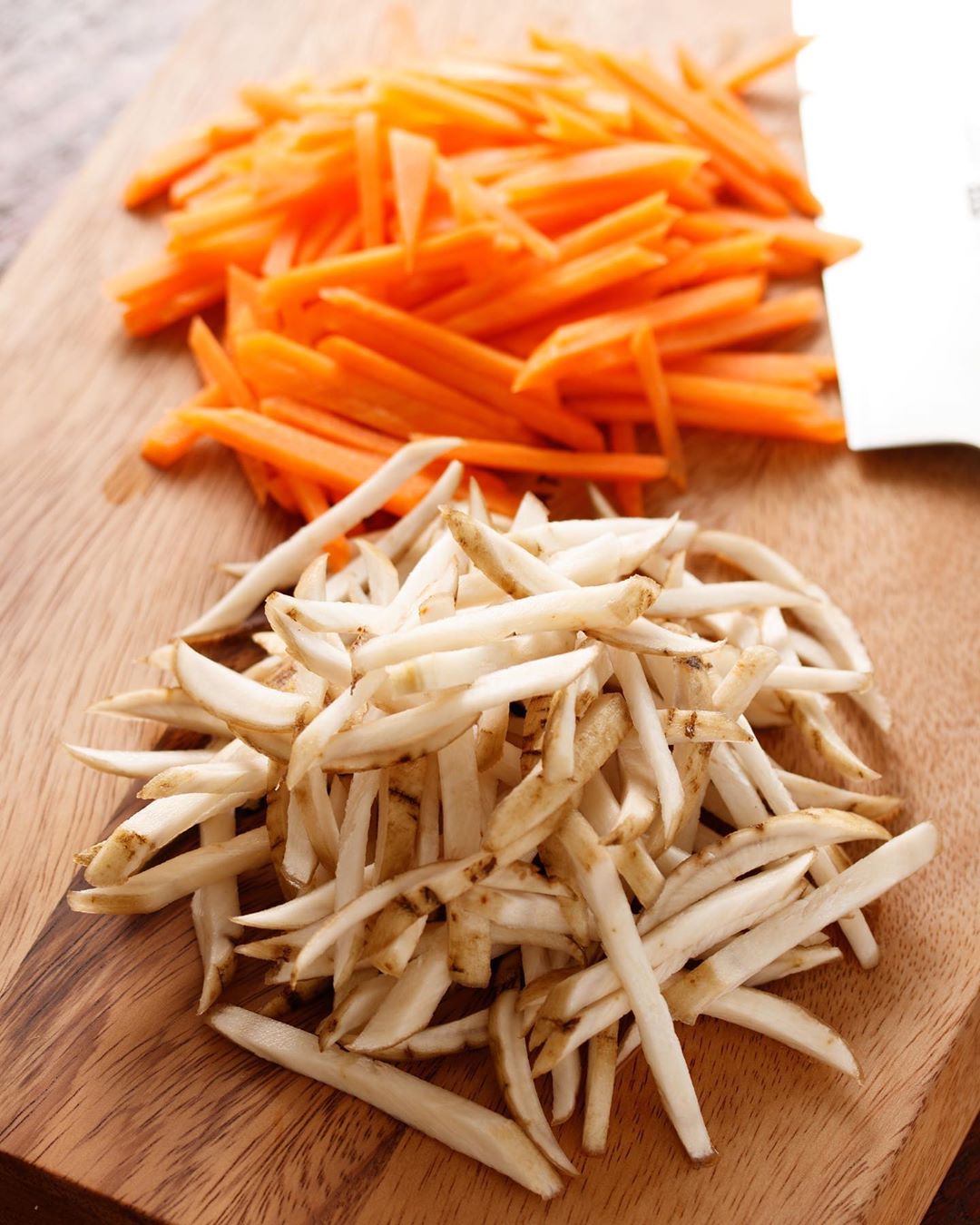 にんじんは細切りに、ごぼうはアルミホイルで皮をこそげ取ってから細切りにする。