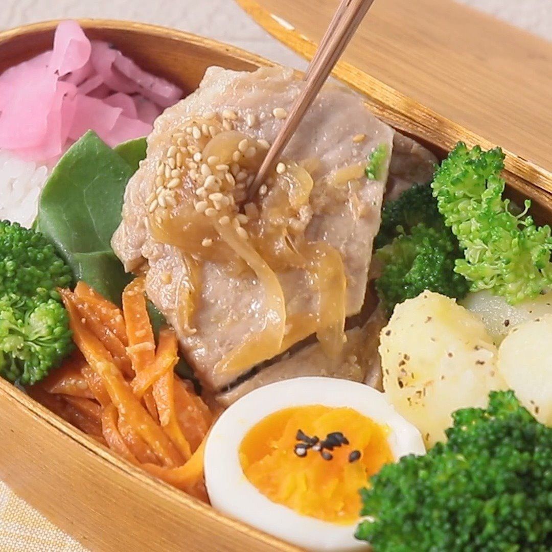 子どもも大人も大好きな豚の生姜焼き。彩り豊かに、見た目も味ももっと美味しくなる『がっつり生姜焼き弁当の詰め方』をご紹介🍱