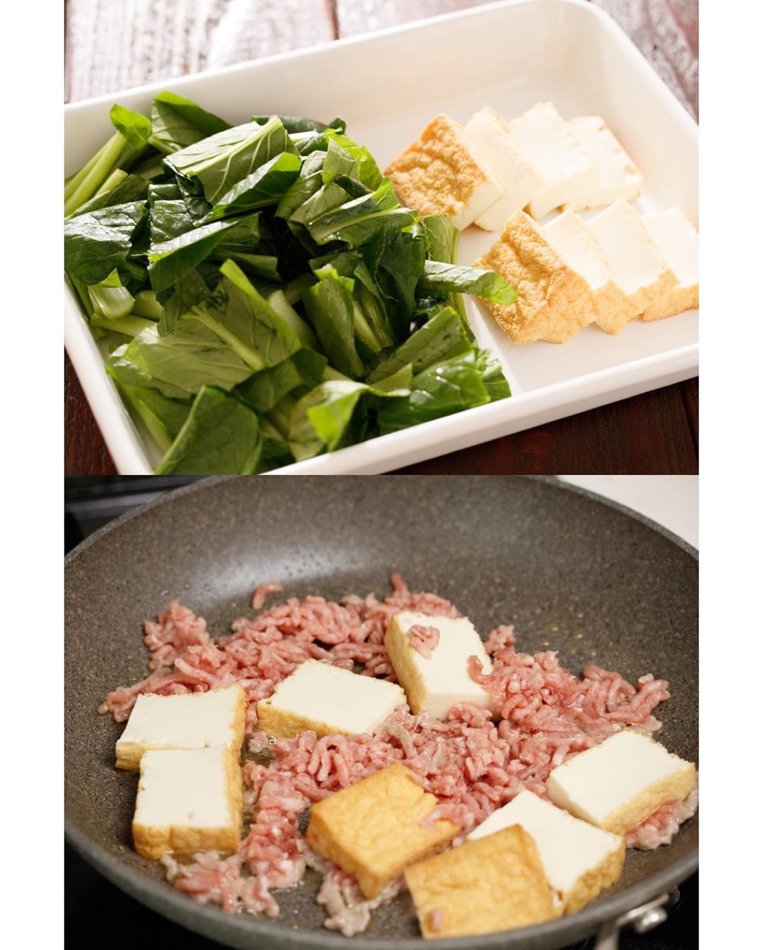 フライパンにごま油を中火で熱し、厚揚げと豚ひき肉を炒める。ひき肉の色が変わったら、小松菜を加えてサッと炒める。