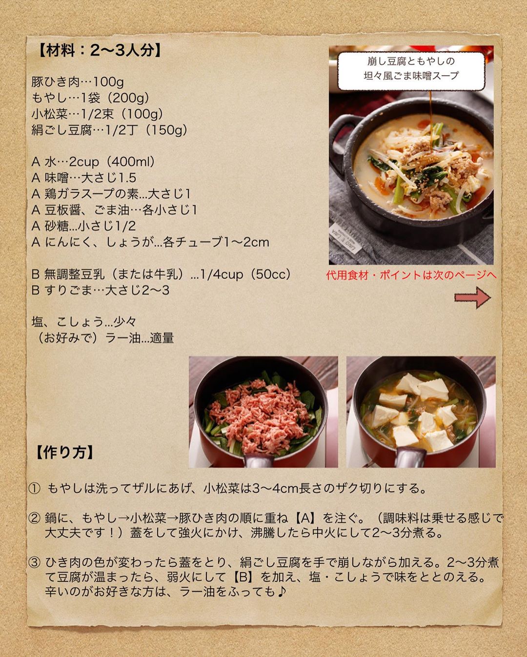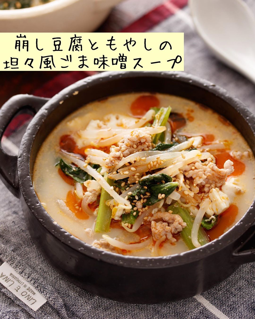 「崩し豆腐ともやしの坦々風ごま味噌スープ」🍲