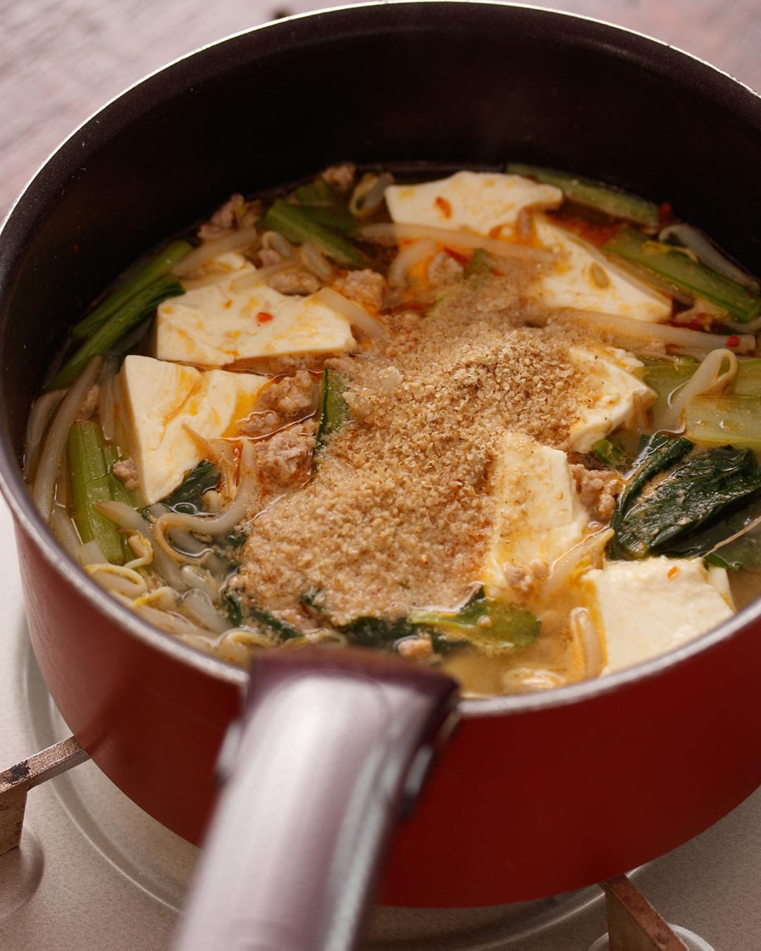 ひき肉の色が変わったら蓋をとり、絹ごし豆腐を手で崩しながら加える。2〜3分煮て豆腐が温まったら、弱火にして【B】を加え、塩・こしょうで味をととのえる。お好みで、ラー油をかけても♪