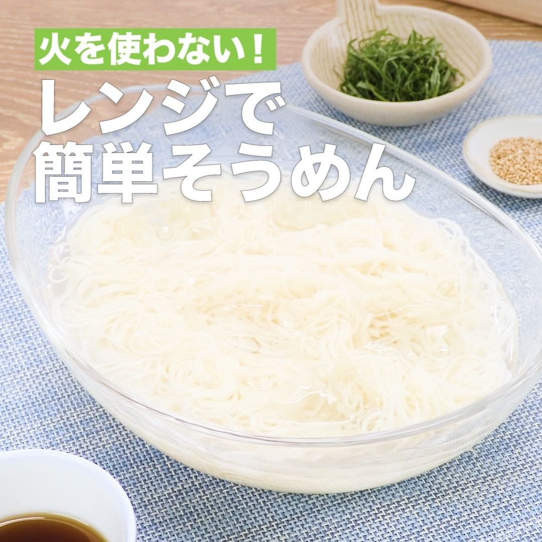 台所に立つのも辛いような暑い日に、レンジで作るそうめんはいかがですか♪そうめんをレンジで加熱する前に、しっかりとほぐすことが均一にゆでるコツです。お好みの薬味を添えてお召し上がりください♪