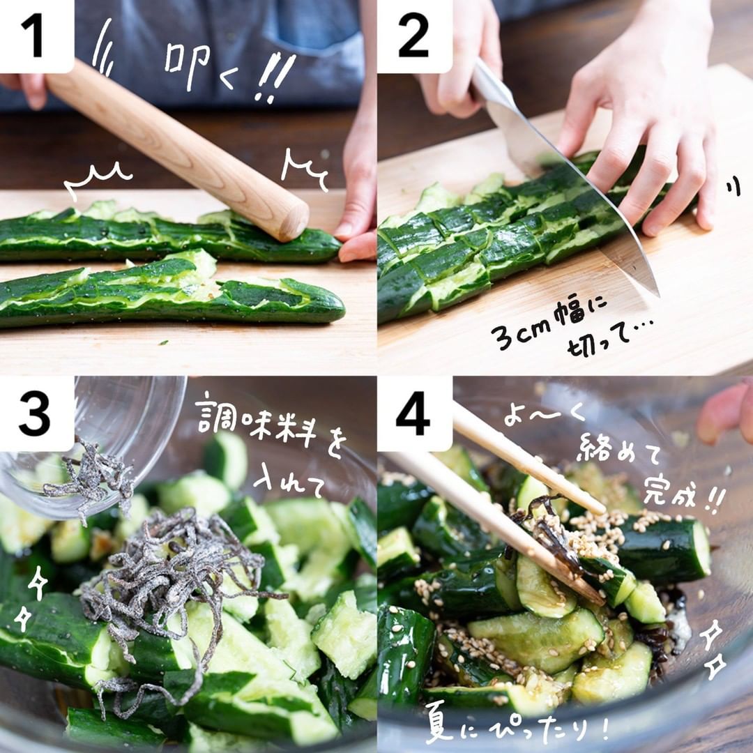 1. きゅうりはめん棒で叩いてヘタをとり3cm幅に切ります。