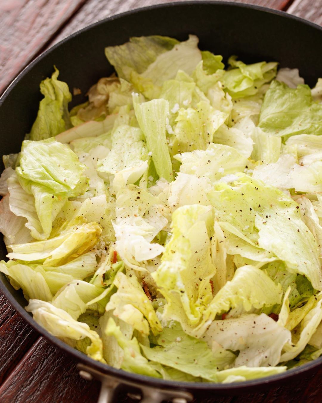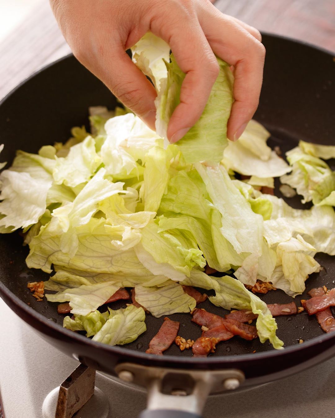 レタスを加えてサッと炒め、全体に油が回ったら火を止め、塩・こしょうをふる。