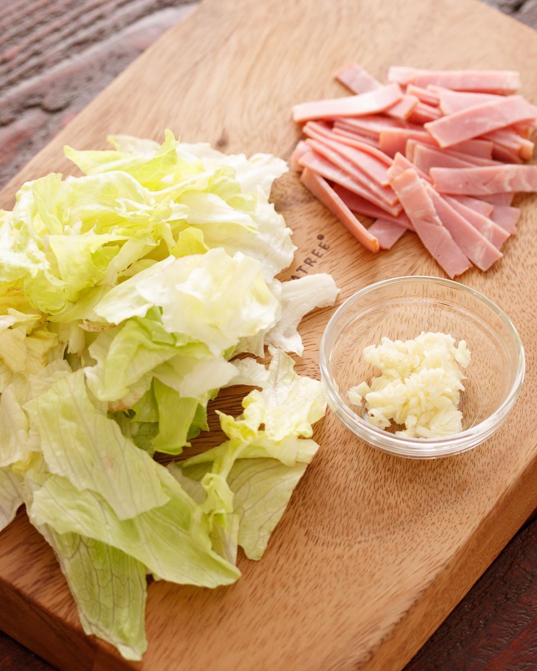 レタスは手でちぎる。ベーコンは短冊切りに、にんにくはみじん切りにする。