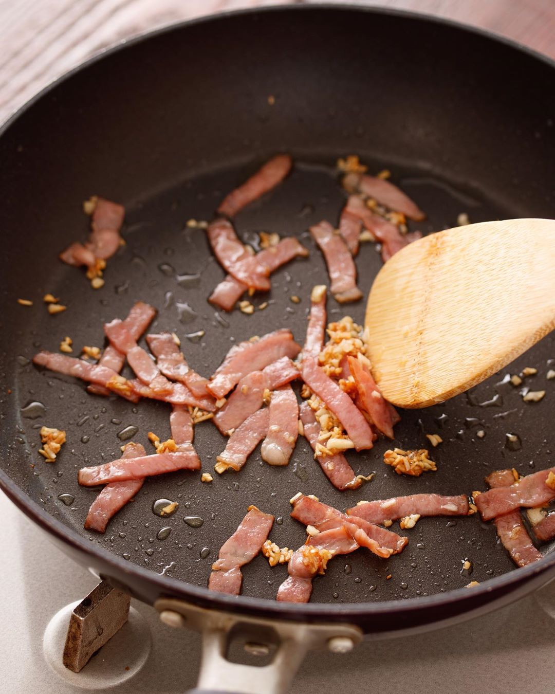 2️⃣《にんにくとベーコンを炒める》
