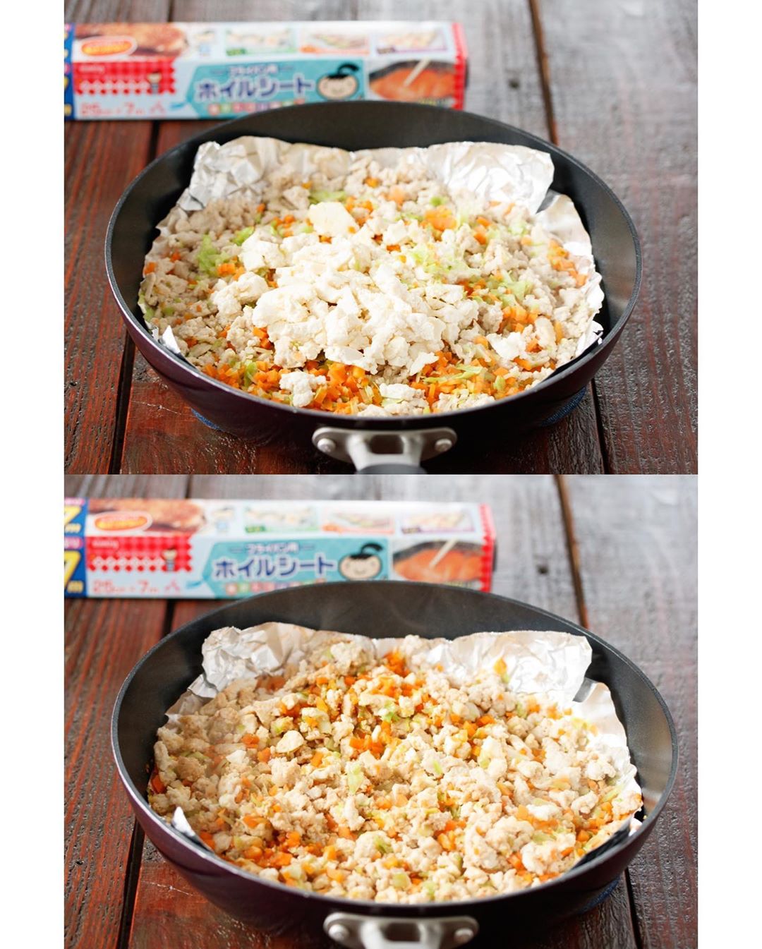フライパンに新しいキチントさんフライパン用ホイルシートをに敷き、鶏ひき肉を中火で炒めます。色が変わったら、キャベツとにんじんを加えて炒め、全体に火が通ったら豆腐を戻し入れます。